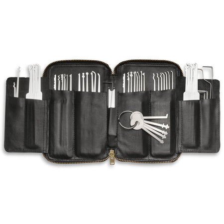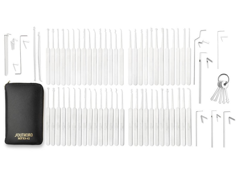 *IMPROVED* The biggest improvement ever in a large set,our new MPXS-69 SouthOrd lock pick set has no duplication of picks, and offers the greatest versatility ever in opening pin tumbler locks. Included in this complete lock pick set are twelve US picks with metal handles, fifteen Euro/Slim Line picks with metal handles, fourteen US standard picks, fifteen Euro/Slim Line standard picks, five warded picks, and eight tension tools – a total of 69 pieces - and includes the finest top quality zippered leather case available.