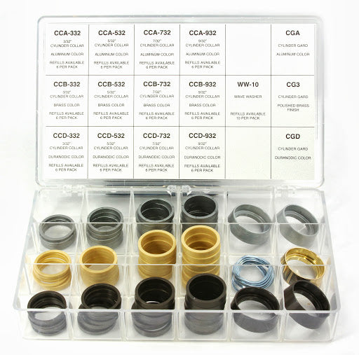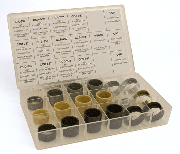 The CAK-15 is a cylinder accessory kit that contains an assortment of popular hardened cylinder gards, plus cylinder collars molded from an "Engineered Plastic". Unlike steel or aluminum that can chip, scratch or bend, collars from engineered plastic will not loose their finish or shape. They also resist damage due to the ozone and by ultra violet rays. The kit is packed in a handy plastic box for storage and part numbers are identified for reordering. Cylinder collar refills are available in packs of 6. See kit item below for sizes and kit contents. A handy assortment for mobile use. |