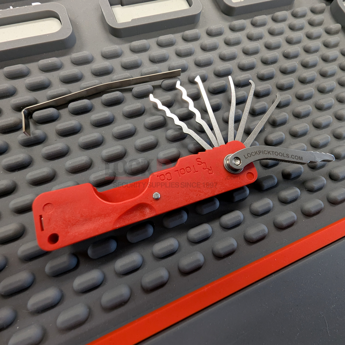 A jack knife lock pick set is a compact, folding pick tool where multiple picks store inside a single handle, similar to a pocketknife. It offers quick deployment, safe storage, and easy portability.